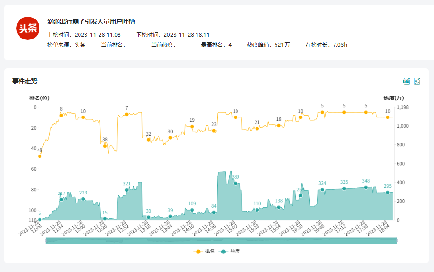 11月27日18:00-11月29日23:59,百分点舆情洞察系统监测到“滴滴崩了”相关的信息约204,081篇次,11月28日09:00达到传播峰值12,144篇次。