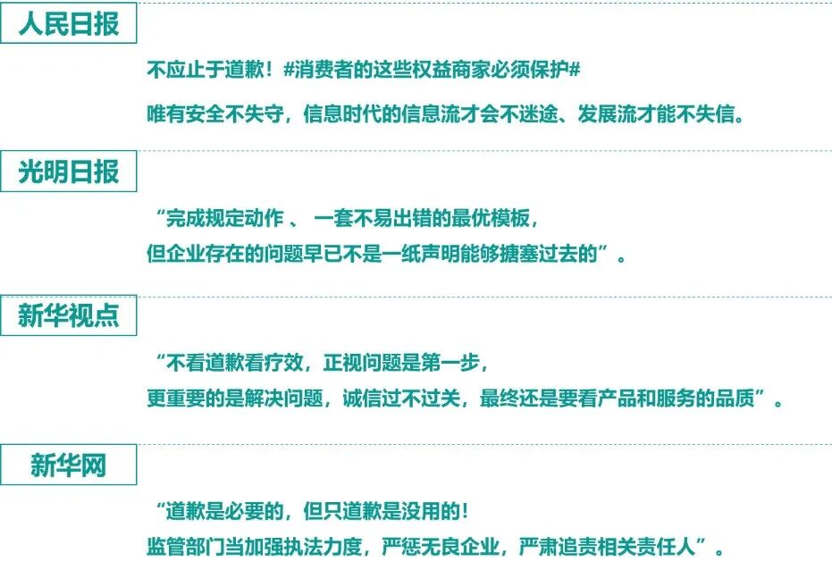 通过3•15晚会涉事企业的回应梳理发现,英菲尼迪、360搜索、长安福特、UC、猎聘反应迅速,均在3月15日当天做出回应,回应渠道也大致集中在微博、媒体访问回应两个方向;回应的具体详情内容,主要集中在道歉、提出具体解决办法两方面。
