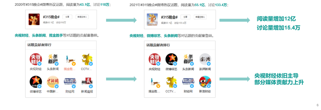 虽然互动参与度有所下降,但调研发现,去年晚会至今年晚会结束期间,微博话题#3•15晚会#的阅读量增加了12亿,讨论量增加了15.4万,8个月的时间里,网友对3·15晚会的关注和讨论依旧较高,可见网民对于维权的话题依旧具有一定的关注度。