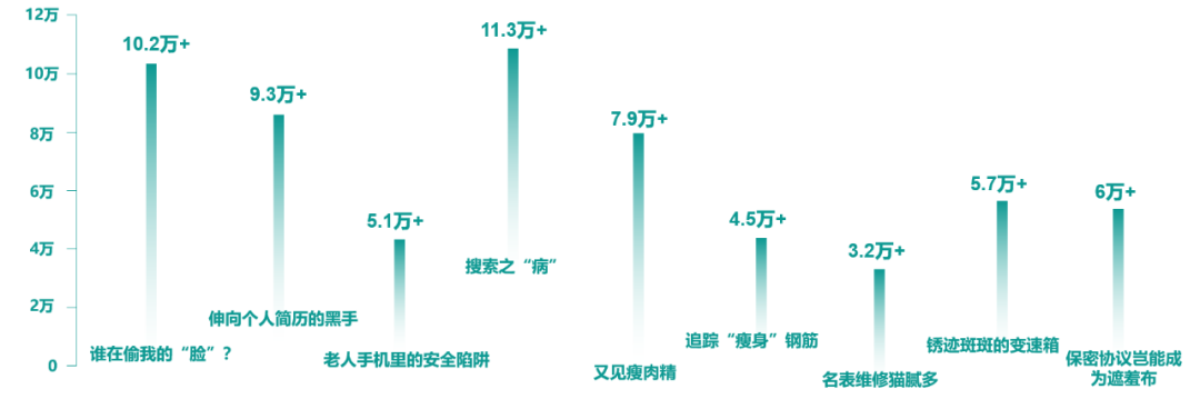 而今年3•15晚会播出后,从监测数据来看,传播内容基本以晚会曝光内容为主,聚焦在搜索、广告、人脸信息、简历、福特等话题,晚会曝光的热度更偏向于个人信息保护和传统的汽车行业。