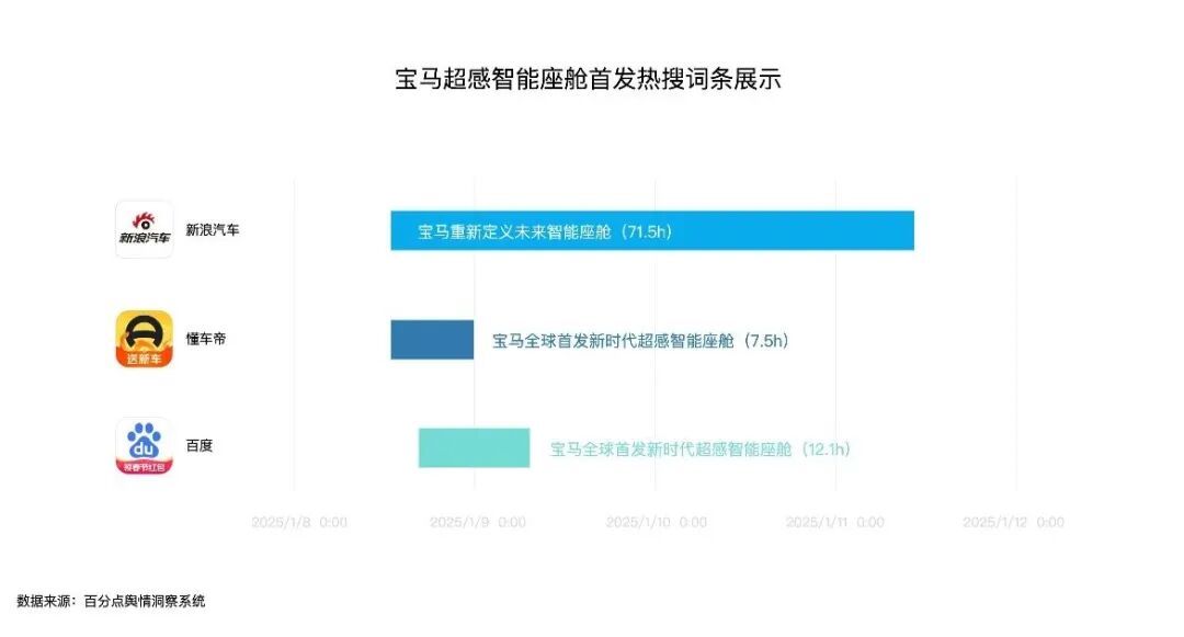 在监测周期内,宝马新世代超感智能座舱营销事件引发新浪、百度与懂车帝三平台用户的强烈关注,相关话题进入热搜榜单。其中登上新浪汽车的话题#宝马重新定义未来智能座舱#在榜时间最长,达71.5小时。该话题微博阅读量3.5亿,讨论量5.1万,互动量9.1万。
