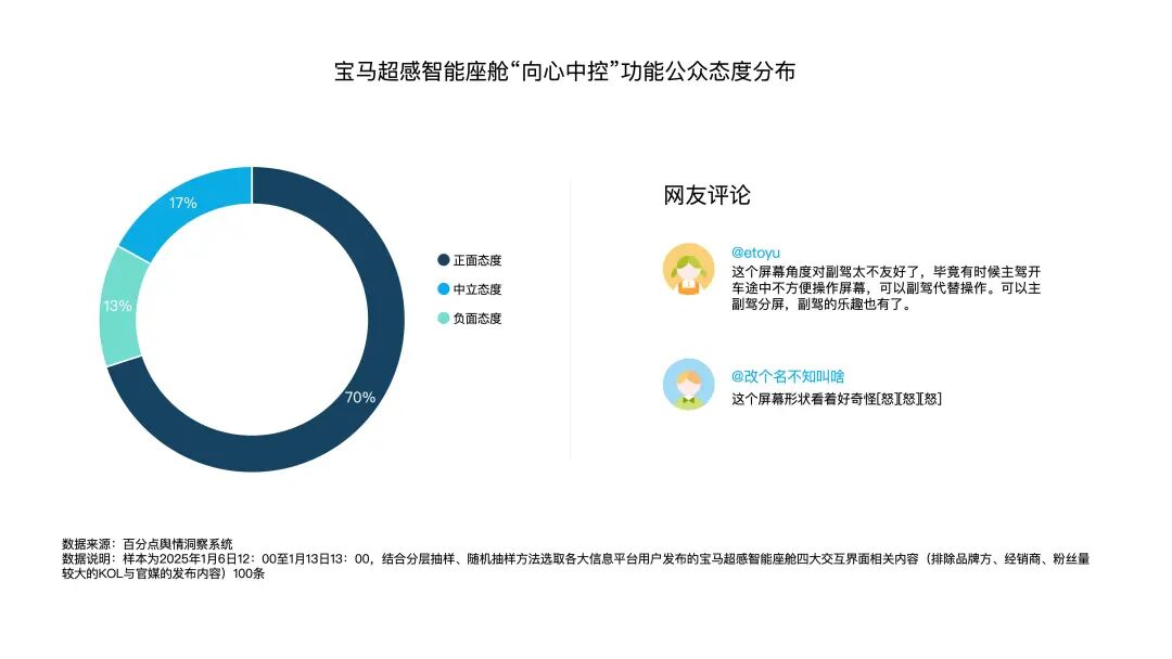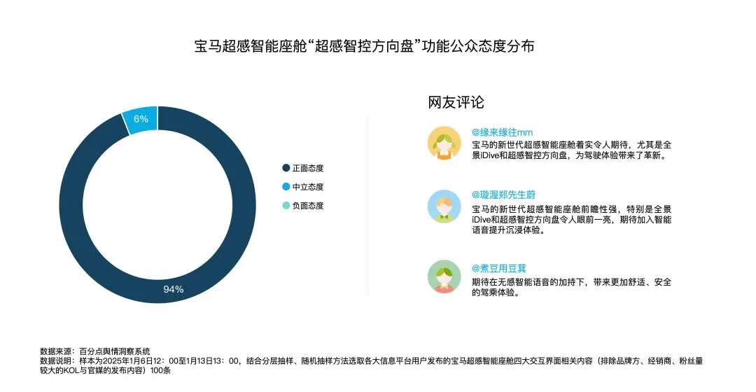 整体来说,公众对宝马智能座舱这一产品持积极态度,正面评价主要围绕四大交互界面所体现的科技感与智能性展开,此外也展示出消费者对产品定价的敏感与对部分群体可操作性的担忧。