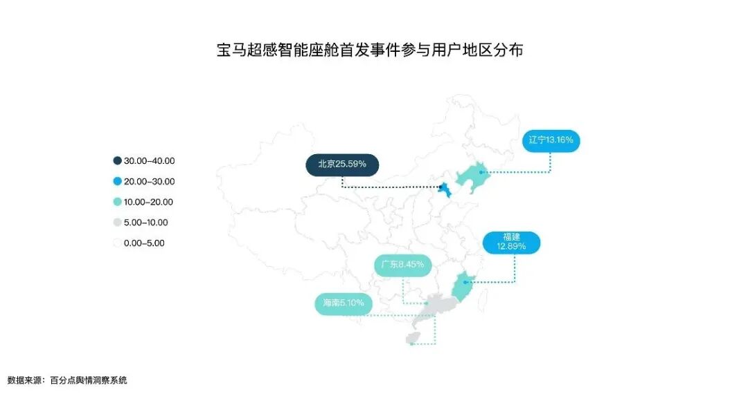 参与该事件讨论的用户主要来自于超一线城市、宝马集团全球重要生产基地与东南沿海地区,IP数量排名前五的省份分别是北京、辽宁、福建、广东与上海,其中北京占比高达25%,远超其他区域用户。经济条件富裕与受宝马品牌文化影响更深的群体对宝马品牌动态更为关注。
