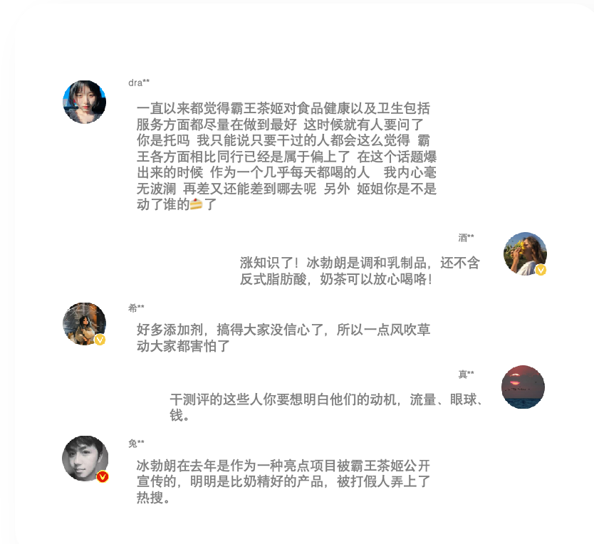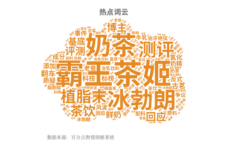 热点词云中霸王茶姬、冰勃朗、奶茶、植脂末、测评、茶饮等词的高频提及,反映了公众对当前茶饮市场,尤其是霸王茶姬的高度关注与热烈讨论。同时,也反映出消费者对奶茶成分(如植脂末)健康性的深切忧虑,以及对专业测评结果的强烈需求,共同推动着茶饮行业向更加透明、健康的方向发展。