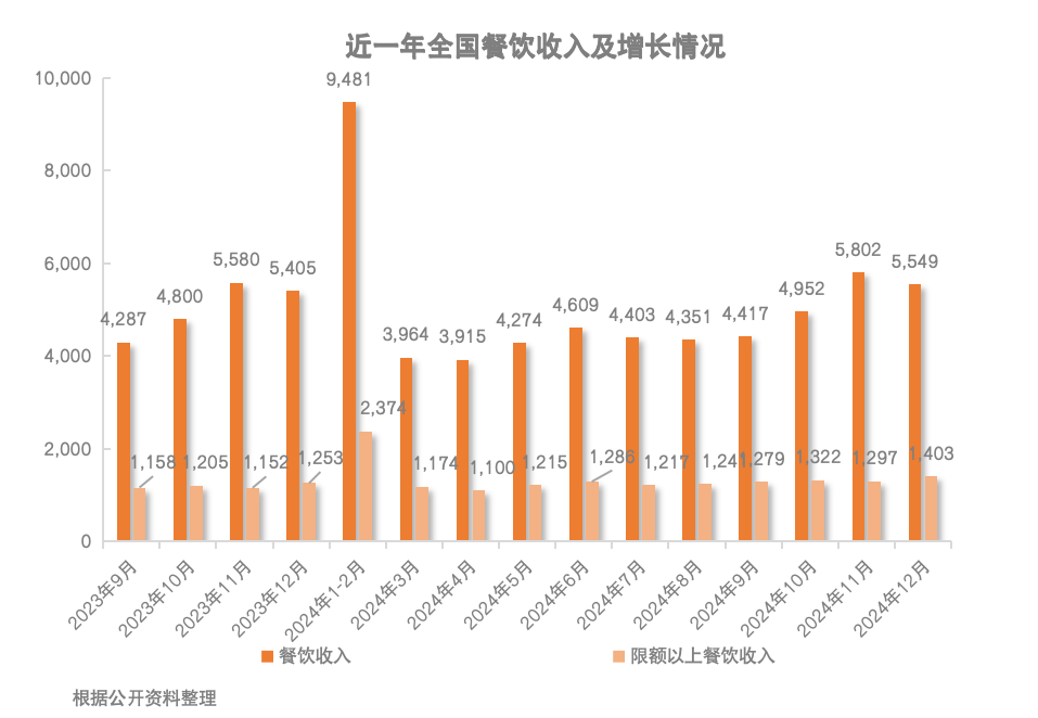 2025年1月17日,国家统计局最新数据显示,2024年12月份全国社会消费品零售总额为45172亿元,同比增长3.7%;其中餐饮收入为5549亿元,占社会消费品零售总额的12.28%,同比增长2.7%;限额以上单位餐饮收入1403亿元,占餐饮总收入的25.3%,同比增长 1.2%。