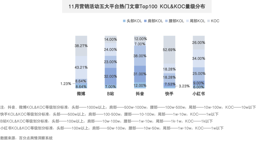 快手KOC形成较强营销力量,在热门文章Top100中占比超五成,内容主要围绕红旗天工08展开。微博尾部KOL与KOC发挥重要作用,在热门文章TOP100中数量占比超过八成,对广州车展上广汽丰田、奥迪等品牌的营销产生较大贡献。