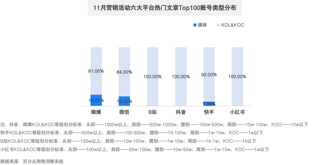 KOL和KOC在主要社交媒体平台发挥重要的营销价值。专业媒体仅在微博、微信、快手三平台发挥出较大的影响力,但占比均不超过二成,广州车展上品牌动态成为热门话题。