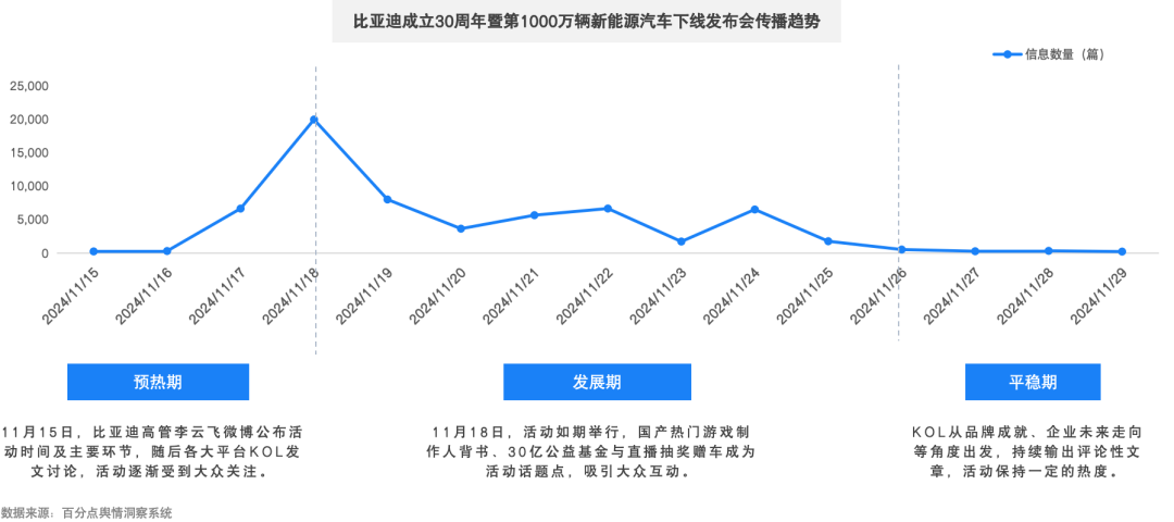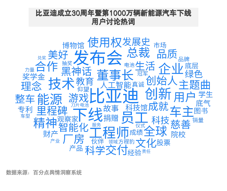 11月18日,比亚迪举行品牌成立30周年暨第1000万辆新能源汽车下线发布会,总裁王传福担任主讲人,围绕创业历程、企业精神、公益规划等内容讲述品牌故事,活动现场邀请《黑神话》制作人冯骥成为车主、直播兑现抽奖赠车承诺等环节引发全网高度关注。