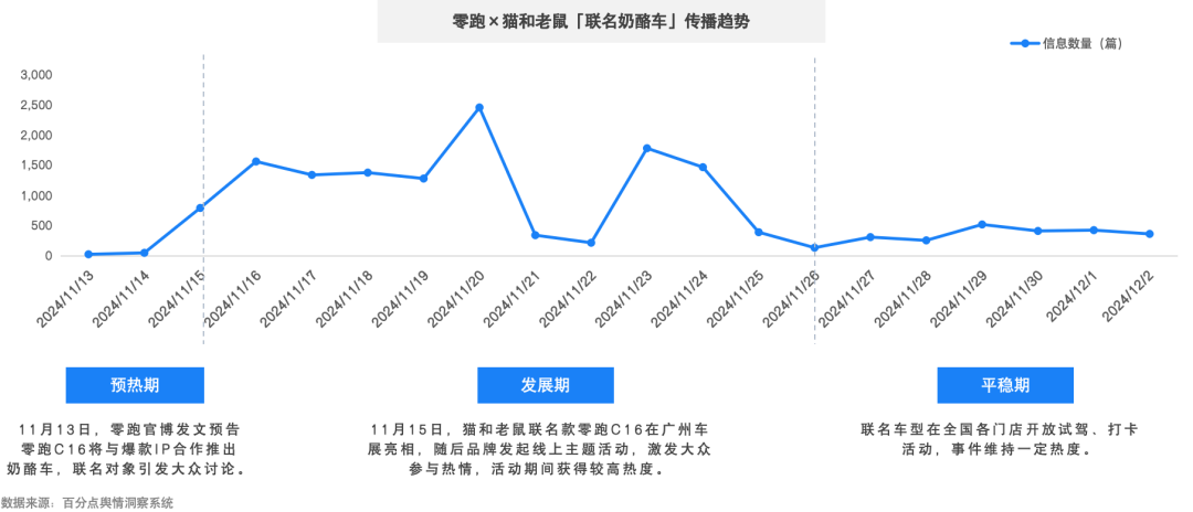11月15日 ,零跑与猫和老鼠联名车型正式官宣并首次亮相广州车展,随后发布线上线下用户互动活动,并持续在全国各门店展出,获得较高的舆情热度。