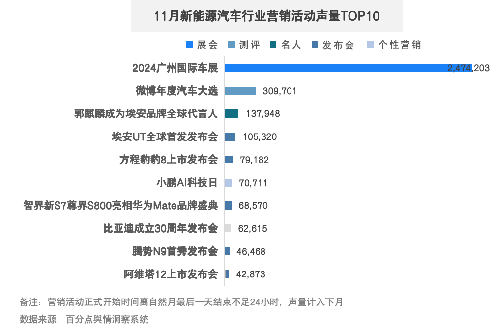 高级别车展对于新能源汽车品牌来说拥有着其他类型营销活动无法比拟的影响力,本月舆情声量名列前茅的事件均为各品牌基于广州车展策划的线下活动,包括新闻发布会、名人观展等。