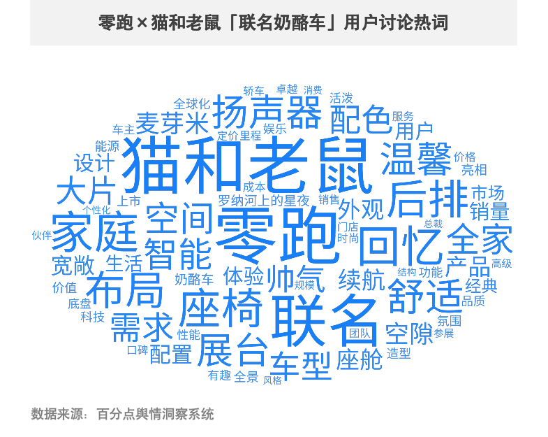 品牌联合《猫和老鼠》动画IP有效激发大众的童年回忆,有两成用户认为此次品牌联合有创意。另外,用户对联名车型的外观、用车体验等方面也较为关注,近三成用户认为联名车的外观可爱,容易获得各年龄层群体的喜爱,此外“温馨”“帅气”“宽敞”“舒适”等也成为高频提及词。