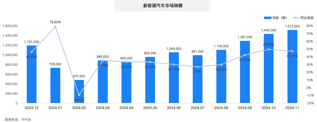11月,新能源汽车市场销量达到151.2万辆,环比上升5.73%,同比上升47.37%。我国新能源汽车年产量首次突破1000万辆,成为全球首个新能源汽车年度达产1000万辆的国家。