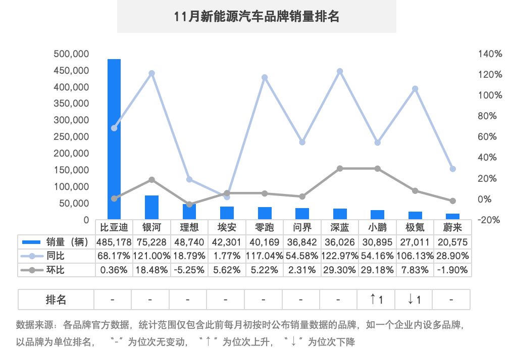 汽车销量头部方阵稳定,除理想、蔚来外品牌销量较上月均实现不同程度增长。比亚迪集团月销量再创新高,零跑月销量首次超过4万,两者提前完成全年销量目标。