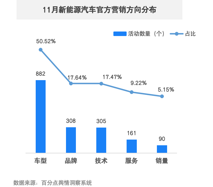 本月车企在品牌与技术两大方向的营销有一定加强,占比均有所提升。多家品牌把握“中国新能源汽车首个年产1000万辆”等行业热点开展营销动作,借助行业里程碑事件,强化品牌正面形象,并结合功能介绍、产品测评等手段营销技术水平,提升消费者对新能源汽车的信心。