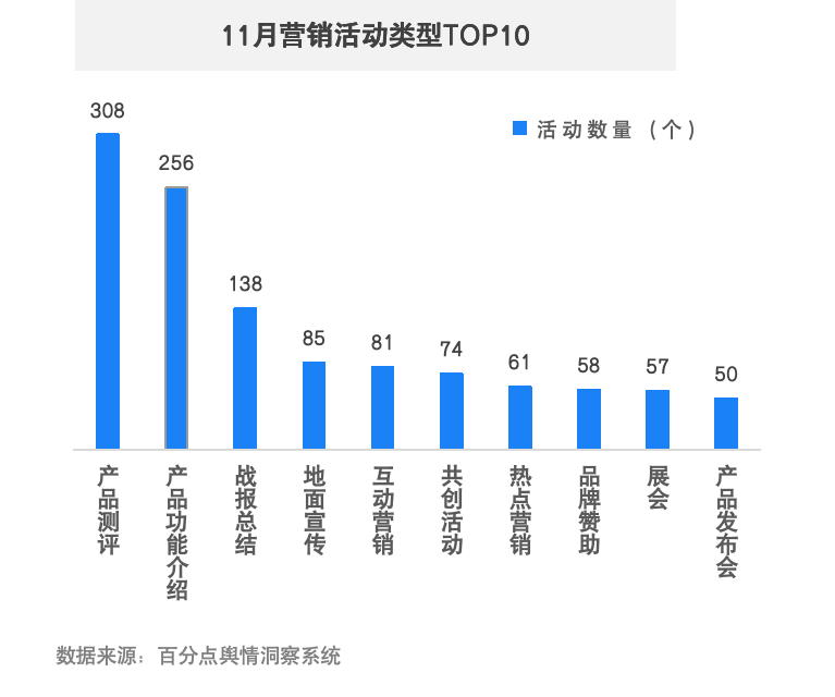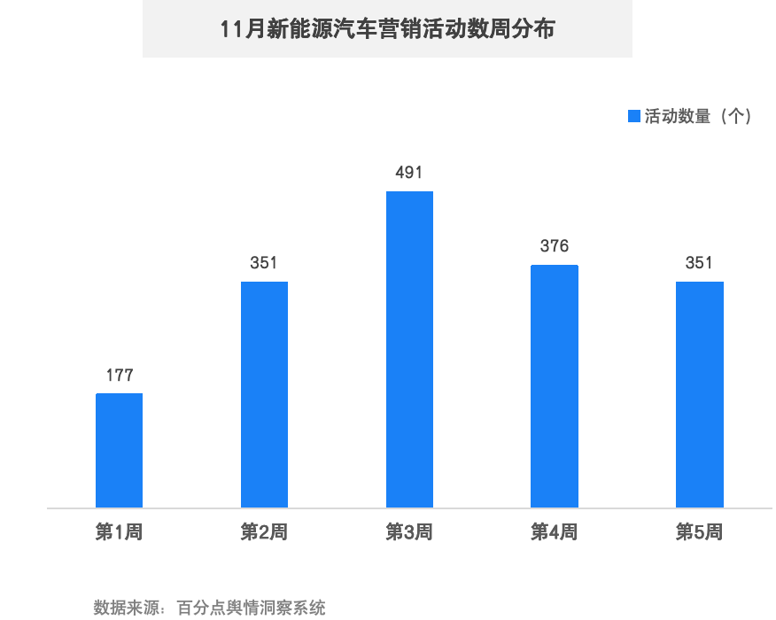 11月,新能源汽车品牌开展官方营销活动共计1746个,环比上升18.13%。受广州车展开幕的影响,第三周品牌的营销动作最活跃,日均活动超70个。